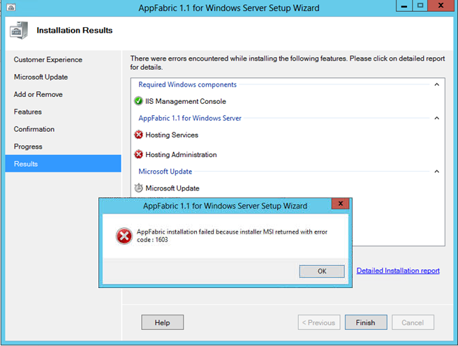 AppFabric installation failed because installer MSI returned with error code: 1603